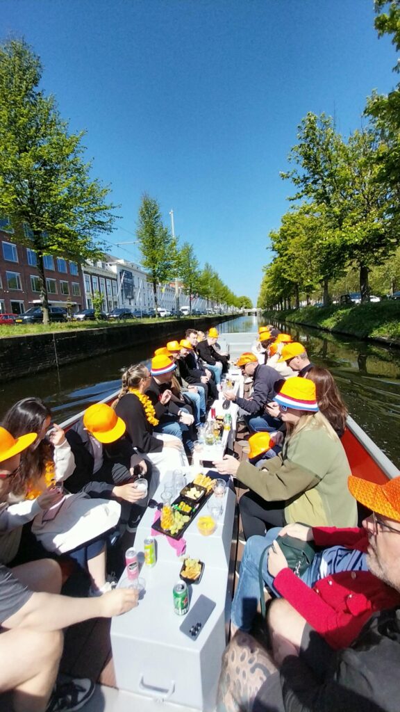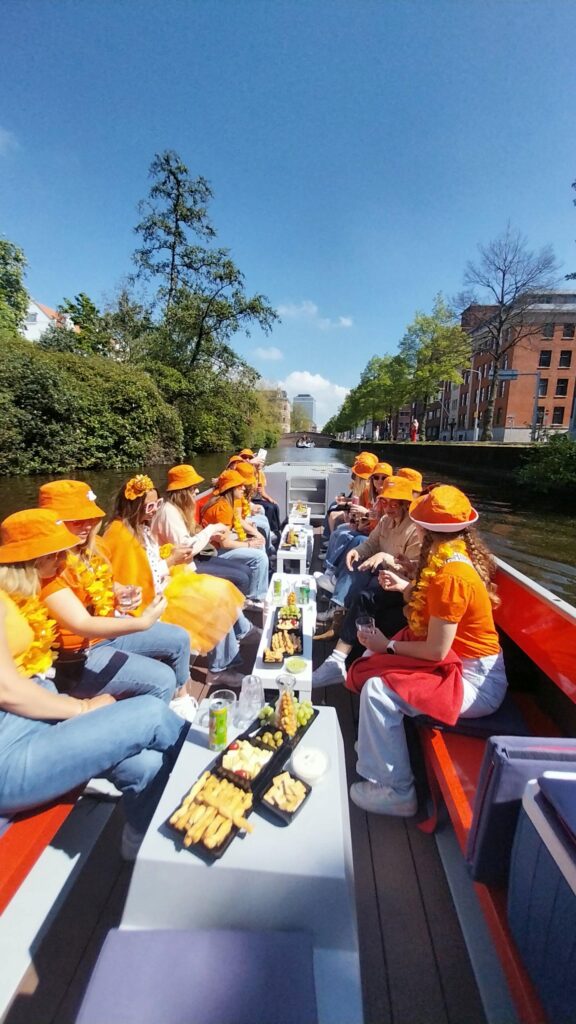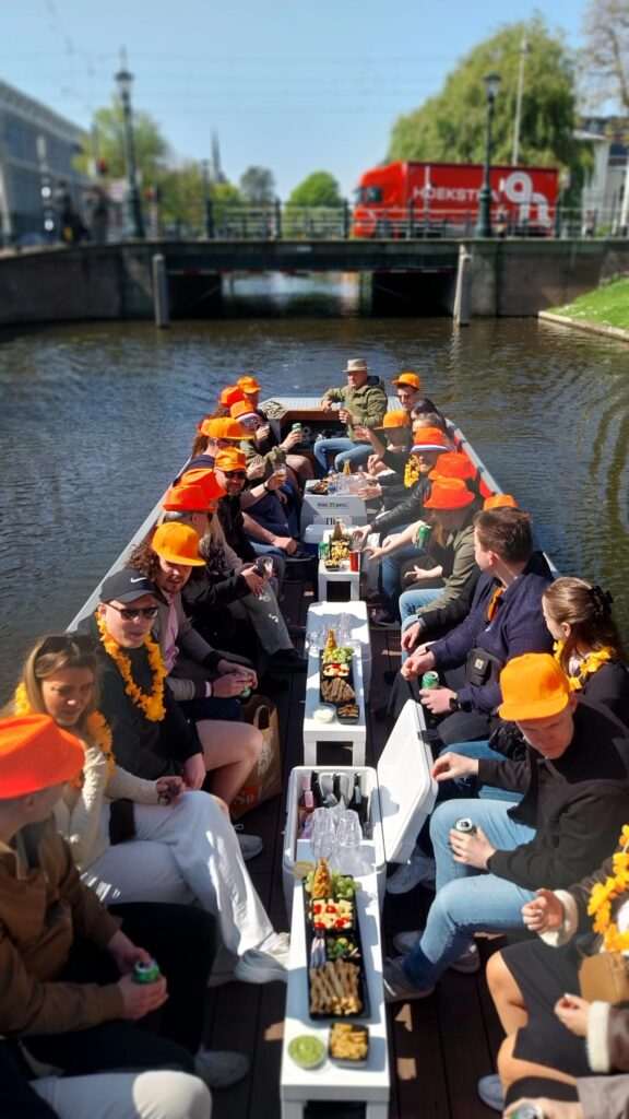 Es macht auch viel Spaß, mit Ihrer eigenen Gruppe zuerst eine Bootsfahrt durch die Stadt zu machen. So können Sie alle Feierlichkeiten vom Wasser aus beobachten. Im Jahr 2026 fällt der Königstag auf Montag, den 27. April, und Sie können ganz einfach online eine Gruppenfahrt bei uns buchen. Mit Getränken und Snacks oder Sie organisieren Ihr eigenes Catering an Bord.